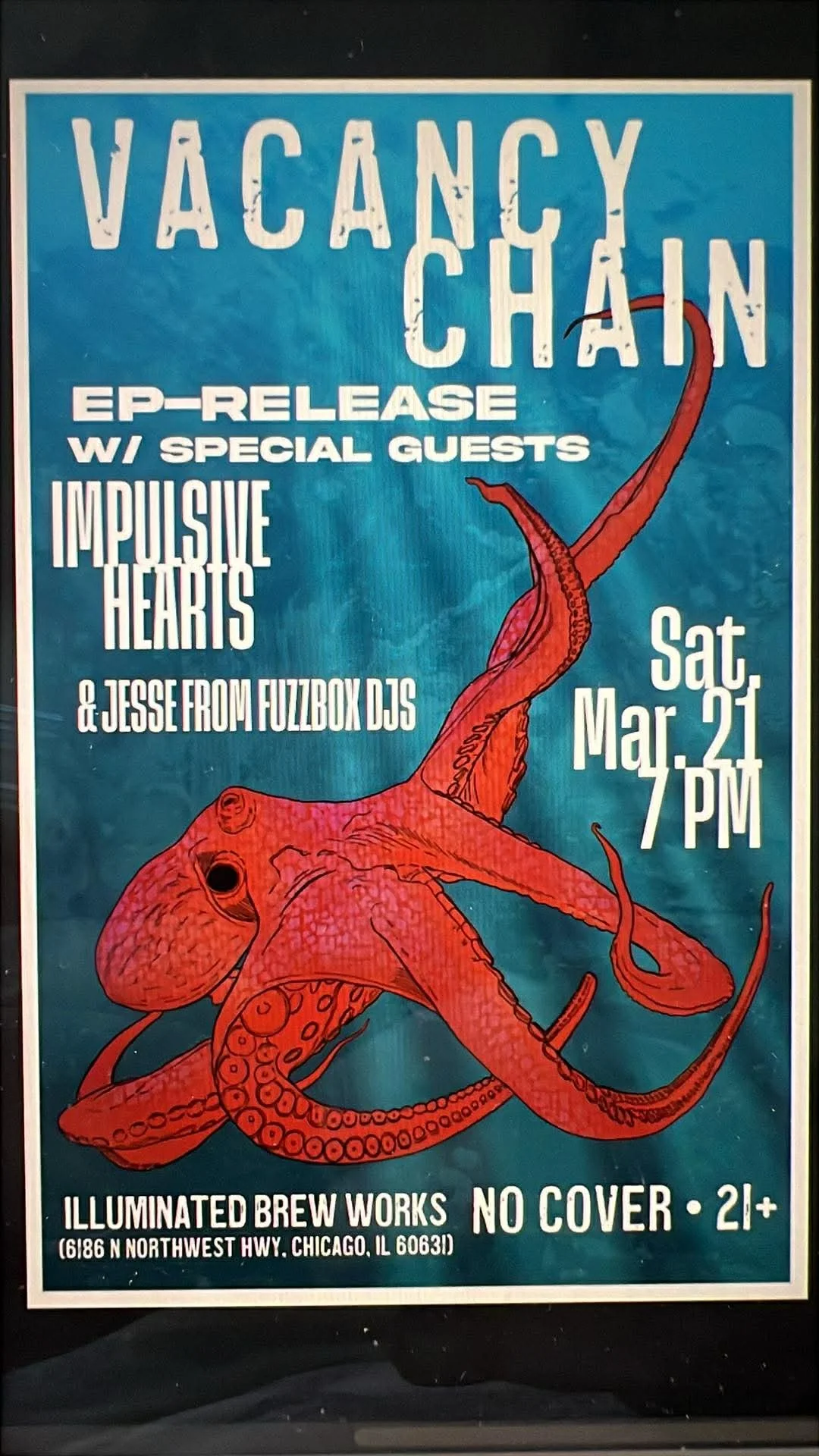 And then at night enjoy free live music from Chicago's VACANCY CHAIN as they celebrate the release of their newest EP. IMPULSIVE HEARTS and 1/2 of FUZZBOX DJs are opening the gambit. The flyer above says the show starts at 7pm but it really doesn't. That's a bald face lie! A mere fabricated truth that won't hold water to our already water-drenched reality. But, you know what, come by at 7p anyway and drink for 2 hours before the bands start. You'll enjoy everything so much more!